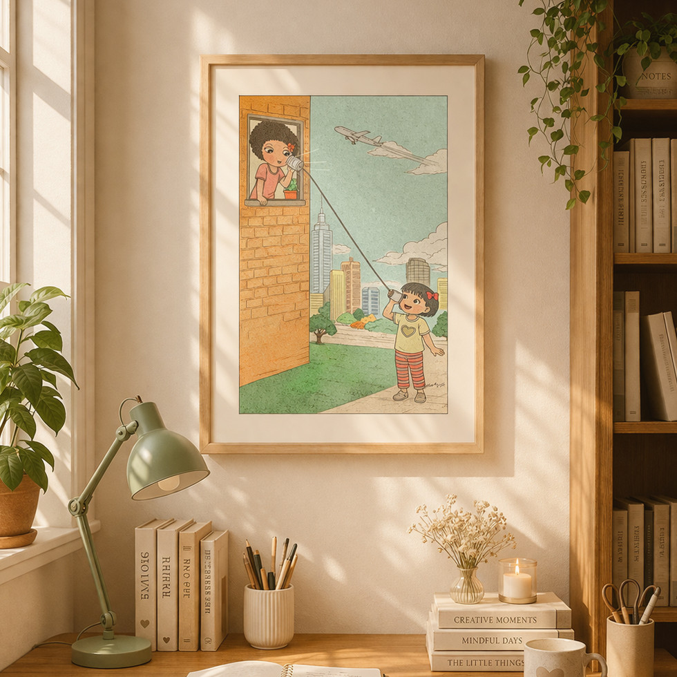 “Across the sky” captures a sweet moment between two friends, linked by a simple tin-can telephone stretching from window to street below. Though they are apart, their voices travel across the open air — carried through imagination, play, and the invisible threads that keep us close.