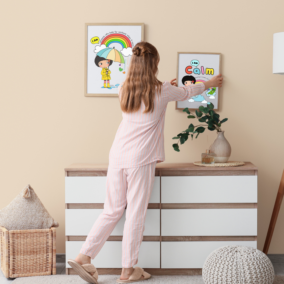 With a bright umbrella, colourful rainbow, and falling heart-drops, this artwork reminds children to find beauty even in stormy moments. Wonderful for encouraging emotional resilience in homes, classrooms, or therapy spaces.